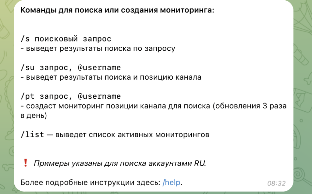 Бот Telegram Global Search предназначен для автоматического мониторинга позиций каналов и групп в поиске Telegram.